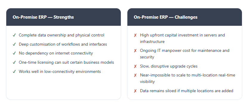 If your business operates from a single location, has no Head Office visibility requirements, manages a modest number of SKUs from one warehouse, and has no near-term plans for expansion on-premise ERP can serve you well. The cloud's advantages are most decisive precisely when multi-location coordination is required. Where it isn't, the calculus shifts.