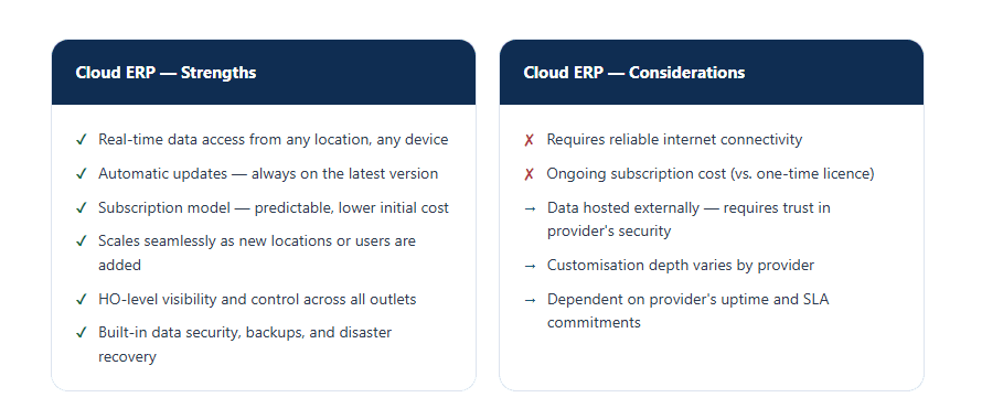 Cloud ERP is strongly recommended for franchise and multi-store retail businesses. It enables the Head Office to centrally manage pricing, promotional schemes, live stock visibility, and real-time performance reporting across all outlets simultaneously. This level of operational control including instant scheme deployment and uniform pricing is extremely difficult to achieve with on-premise or disconnected systems, and becomes more valuable with every location added.