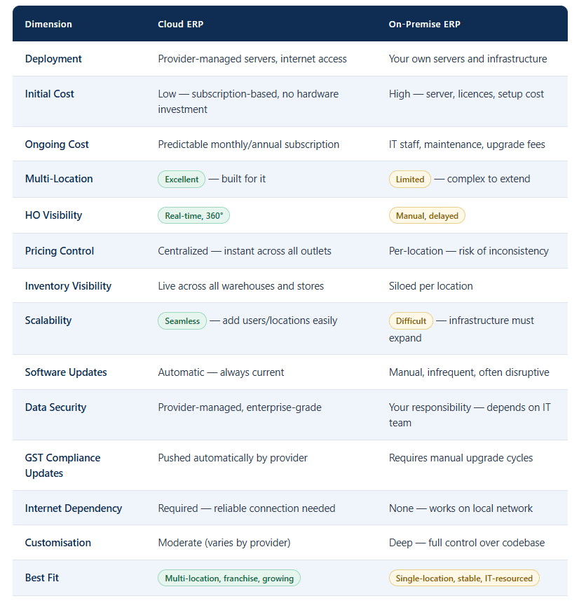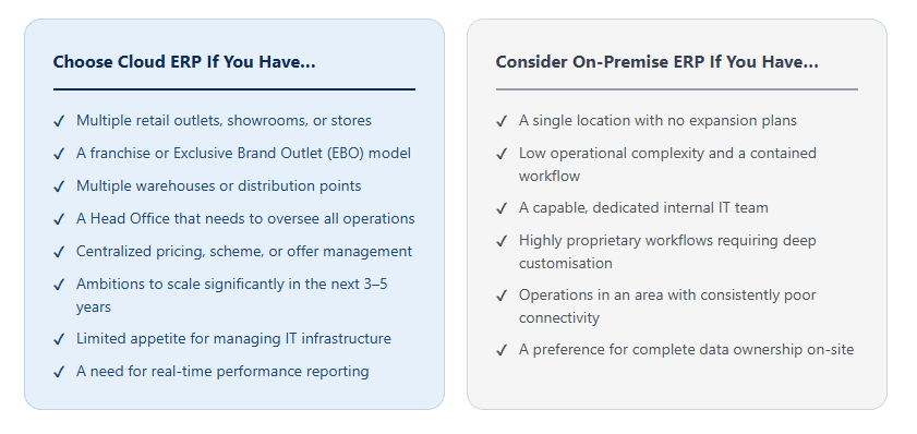 Cloud ERP is generally the better choice for multi-location retail chains, franchises, EBO networks, and distributors with multiple warehouses businesses that need centralized visibility, real-time data synchronization, and HO-level operational control. On-Premise ERP remains a valid choice for single-location, standalone operations with limited complexity and strong internal IT resources.